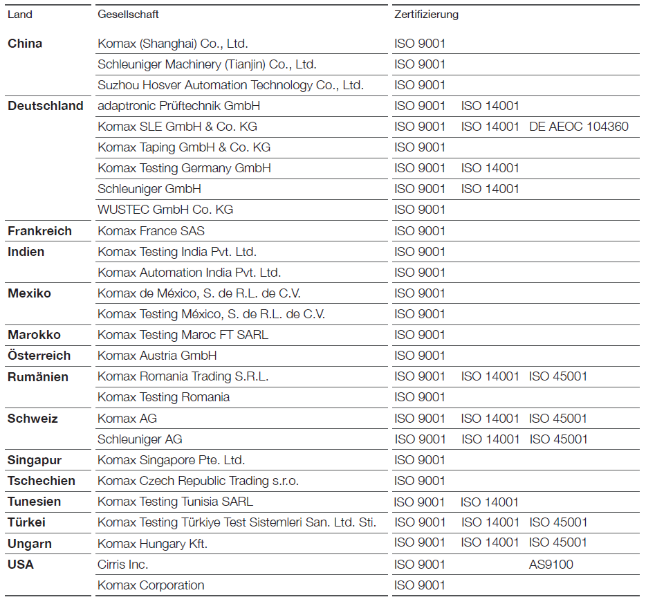 Unsere tägliche Arbeit ist geprägt von hohem Qualitätsdenken und der Bereitschaft, unser Handeln immer wieder kritisch zu hinterfragen. Wir bedienen unsere Kundinnen und Kunden mit Lösungen, die auf Anhieb unseren Qualitätsansprüchen gerecht werden. Diese Verbindlichkeit ist die Basis unserer langfristigen, vertrauensvollen Kundenbeziehungen. Die Komax Gruppe entspricht allen geltenden Gesetzen, Rechtsvorschriften und sonstigen gesetzlichen Anforderungen sowie den entsprechenden Normen (ISO 9001, ISO 14001 und ISO 45001) und verbessert kontinuierlich die Wirksamkeit seines Integrierten Managementsystems (IMS).