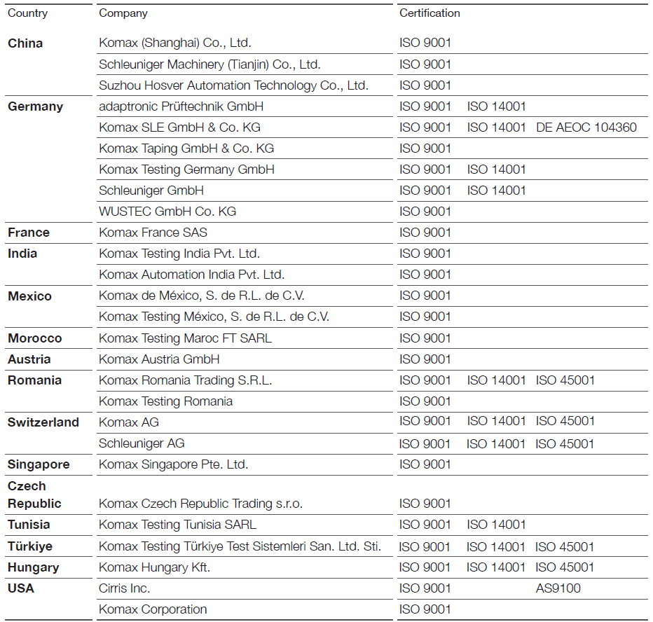 Highly automated, state-of-the-art production systems are used for manufacturing strategically important components. The careful and efficient use of resources has top priority. The majority of the production locations of the Komax Group, are ISO 9001 certified. On top of that, important locations are also ISO 14001 certfied.